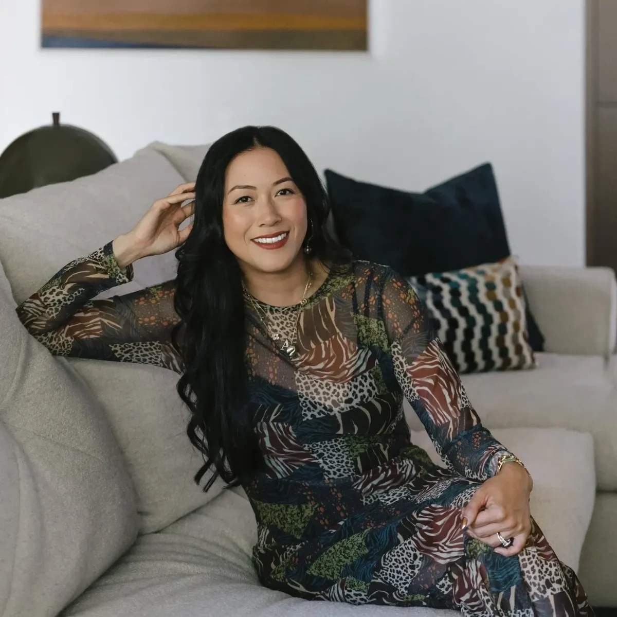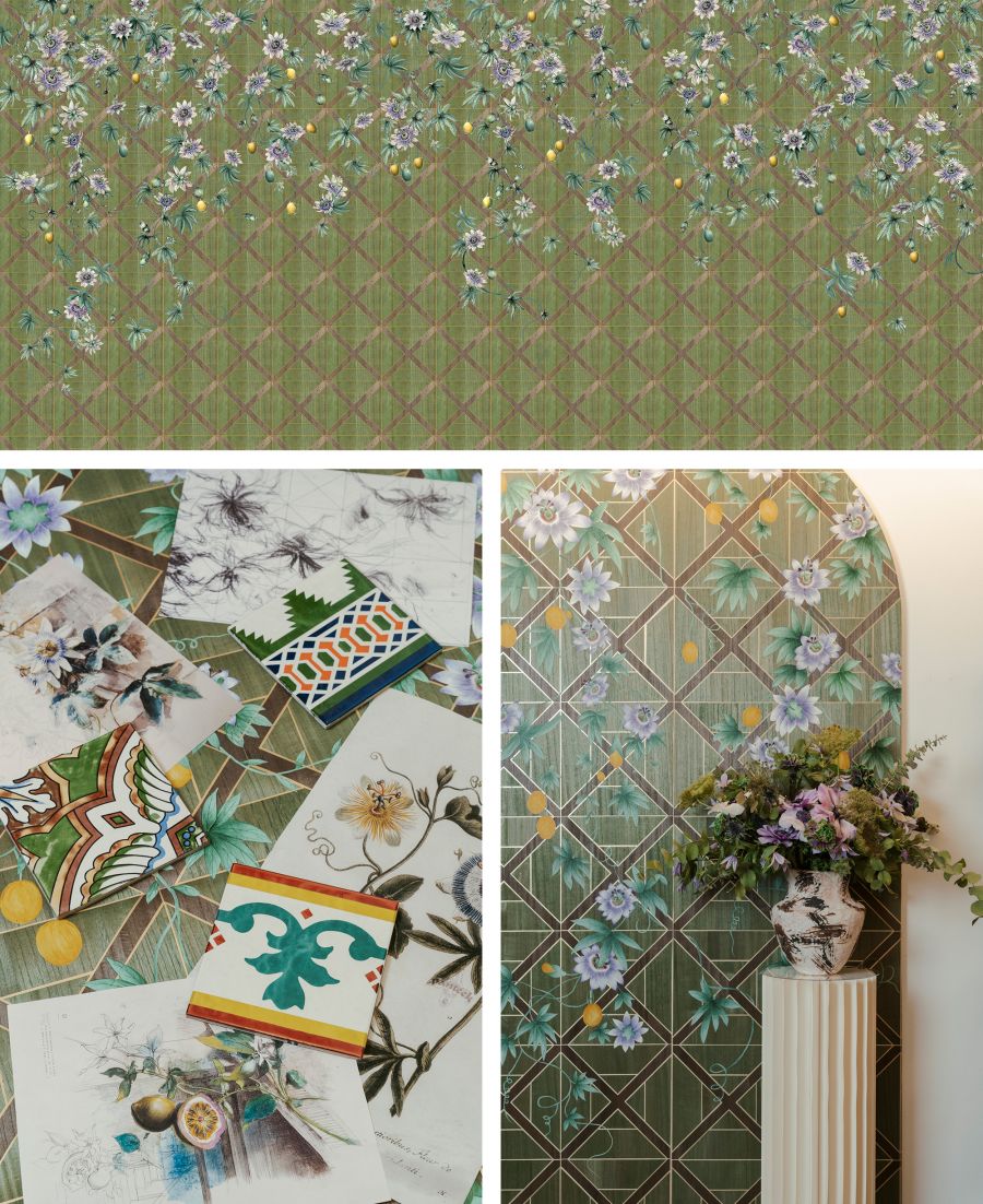 The founder of lifestyle brand Lala Curio, Laura Cheung Wolf, reached out to AAPIDA about creating a capsule collection of wallpapers rooted in heritage, memory, and place. My design, Penang Treillage, features passion fruit vines wandering across trellises, and is hand-painted on marquetry wood veneer. It tells the story of my mother and my mother-in-law, who are both from Malaysia, as well as a morning in the Penang mountains just after I got engaged to my husband. We were having breakfast outside when I noticed passionfruit climbing overhead—which we then got to pick and enjoy. That moment became one of many threads woven into this design: Penang’s unique architecture, the beauty of the Malaysian countryside, and the stories we carry.