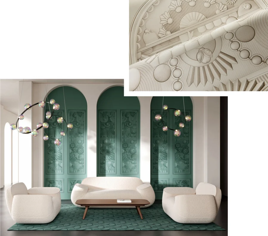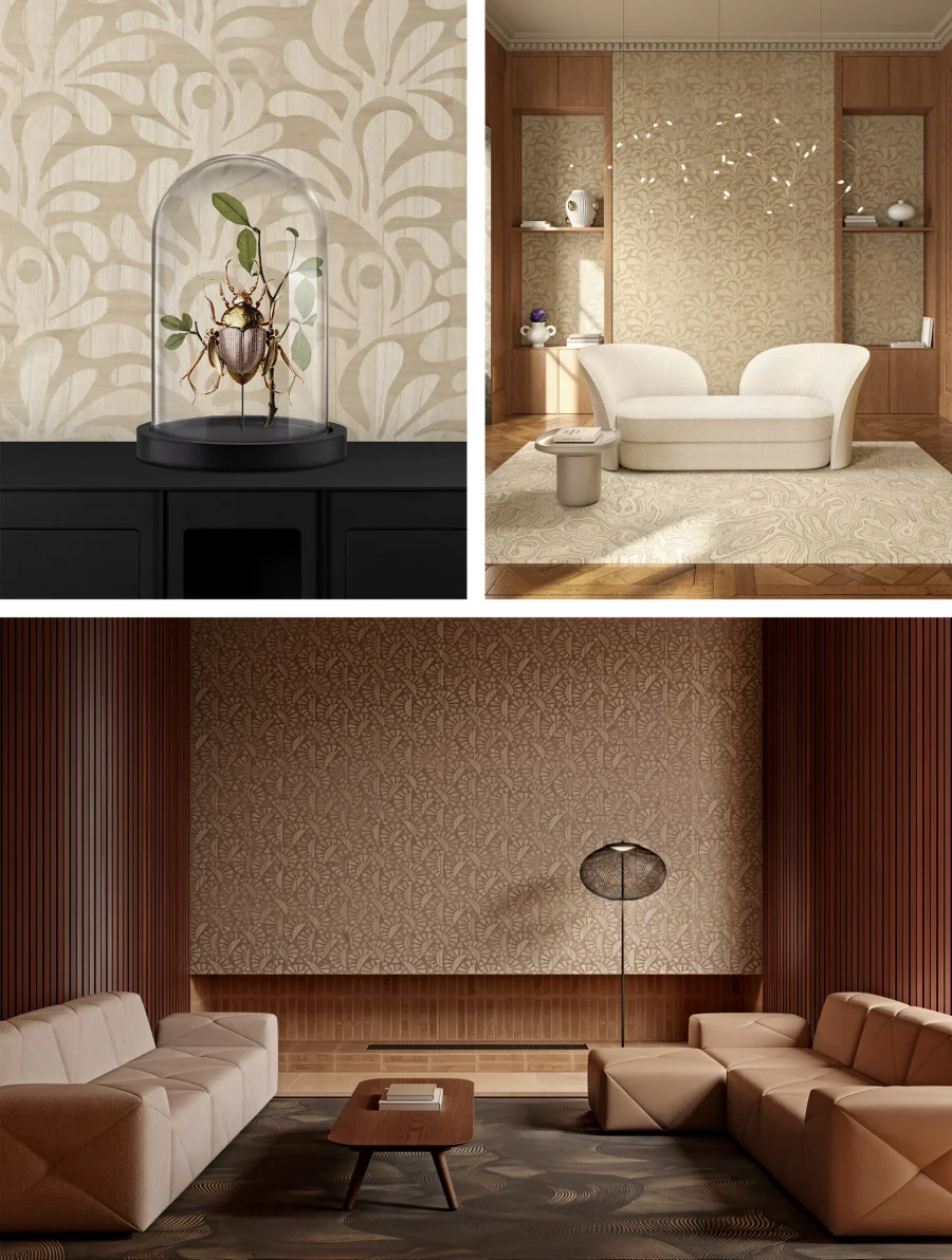 Arte, a third-generation firm run by brothers Philippe and Steven Desart, is based in Belgium’s Haspengouw region, known for fruit production. The rural location gives them proximity to agricultural tradition and an understanding of the importance of biodiversity. With natural materials like silk and wood veneers woven into the designs for textural and sensory effect, there is also palpable respect for the power of Mother Nature and the cycle of life. Much like the “moody cocoons” we see created today with a wash of dark paint, the Green House collection, while playful at first glance, can lend similar gravitas to a room. As A. S. Byatt wrote in her novel Angels and Insects, “The natural world is a delicate balance of beauty and brutality, reminding us of our own mortality.”