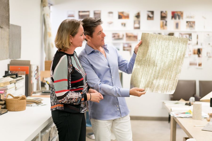 This caught Rocky LaFleur’s distinctive eye. He was an incredible person and had a gift for putting people together. He then introduced me to George Massar and Doug Kinzley, the owners of Gregorius Pineo. They wanted to bring out a new handcrafted texture line. We launched with three designs: Porcelain, Strata and Alchemy.