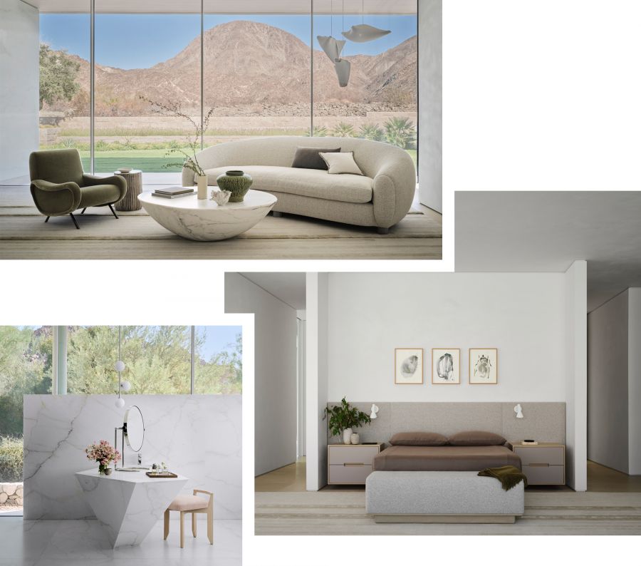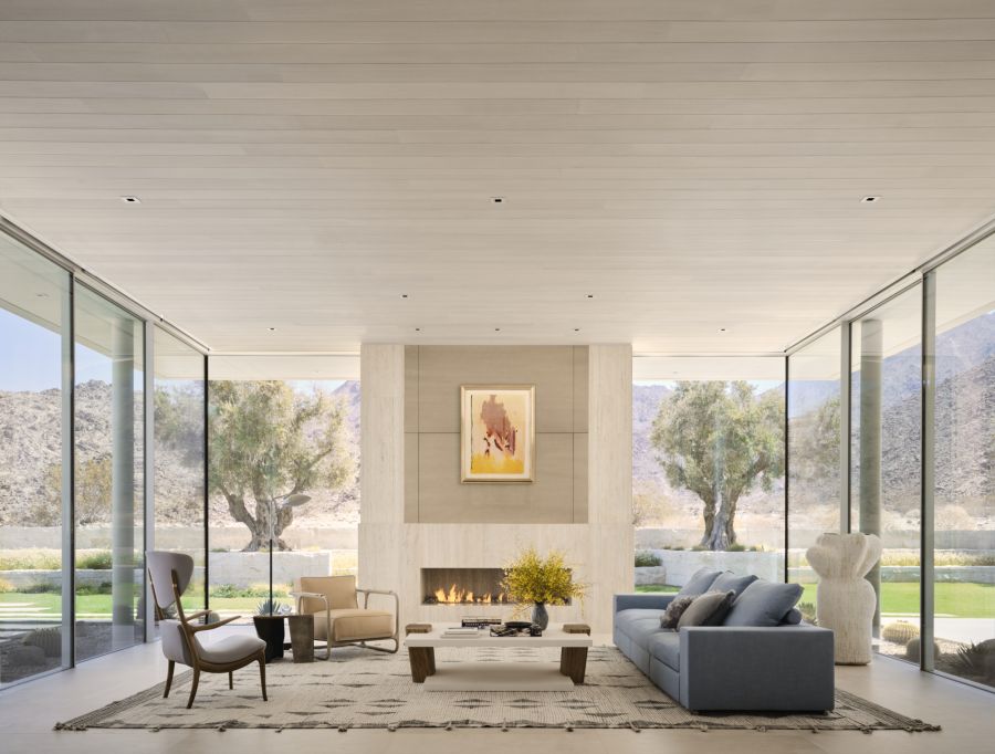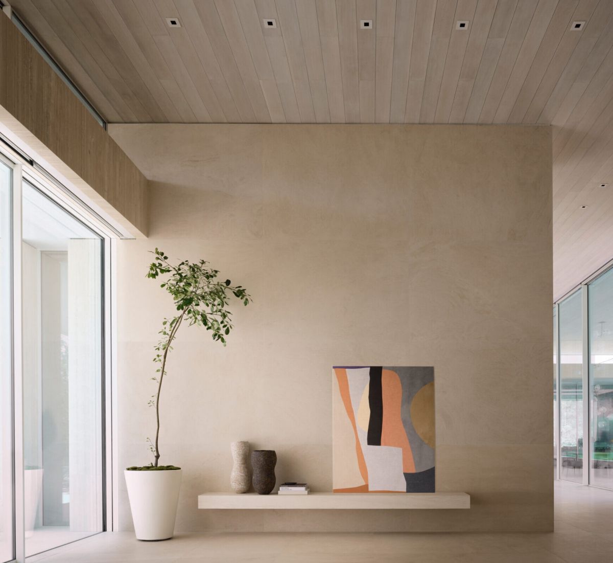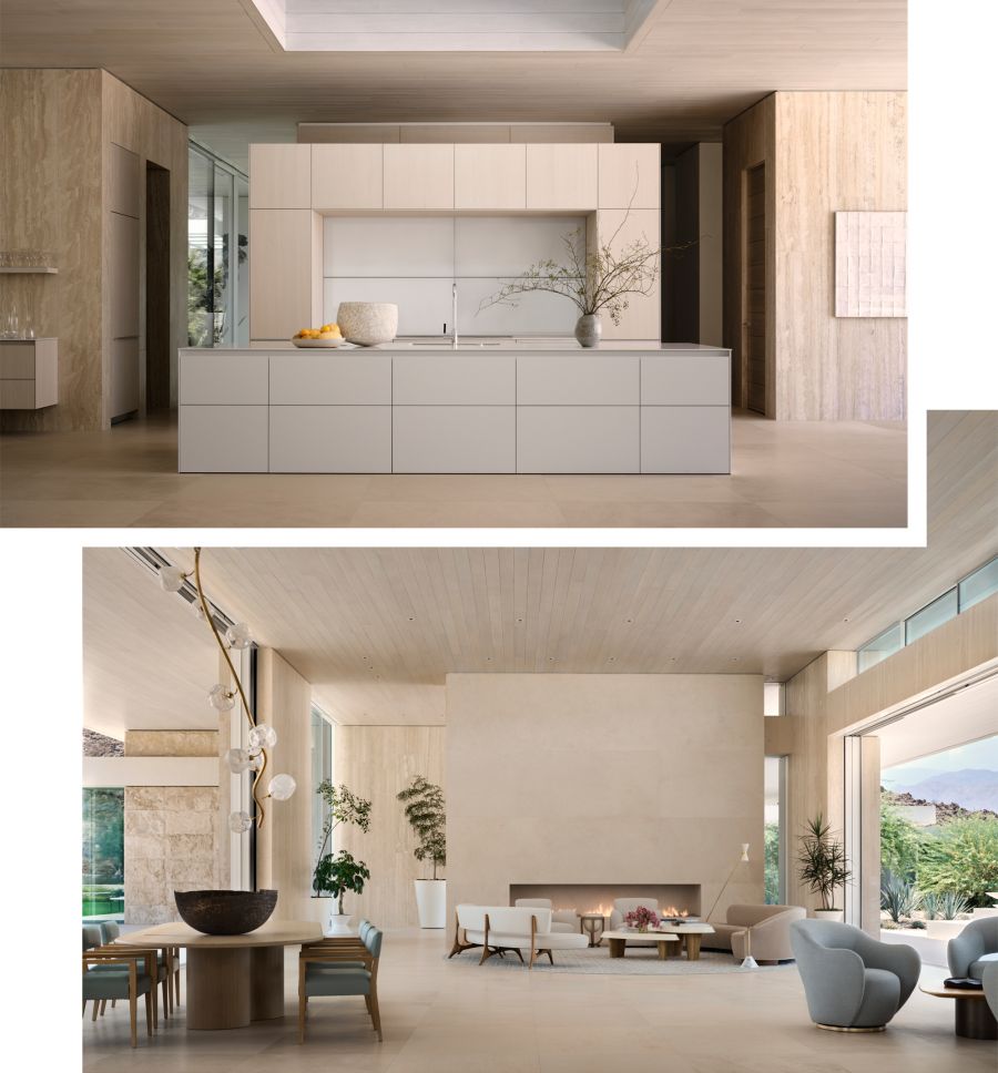 In further reverence to the views, Hollis connected the interiors to the landscape with indoor trees, an artform of its own in the hands of Stephen Block of LA’s Inner Gardens, as well as with ceramics. The organic shapes and rough textures of selected works—Kati Tuominen-Niittyla’s stoneware vessels on the kitchen island and dining table, Kristina Riska’s monumental standing sculpture in the family room, for example—subtly reference the desert’s rugged terrain.