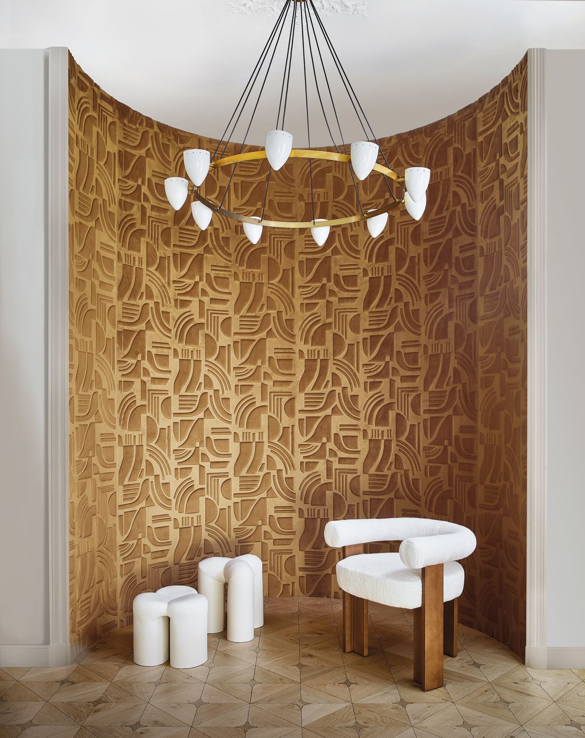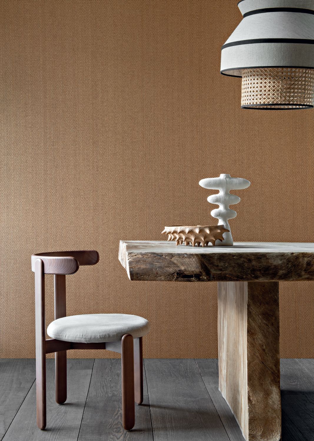 Pristine through Benjamin Moore; Stella dining table tby Syrette Lew hrough Schumacher; Slice table lamp through Kravet; Rose Tarlow Lucia candle with green notes through Shears & Window