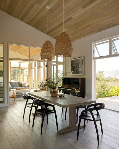 “For our “surf shack” near Pleasure Point, Santa Cruz, the east-facing house greets the morning sun, protected by a tree house and surrounded by breaking waves on all three sides of the property. We perched a double-sized round daybed at the very tip of the landscape to create the ultimate restful and organic soundscape.”